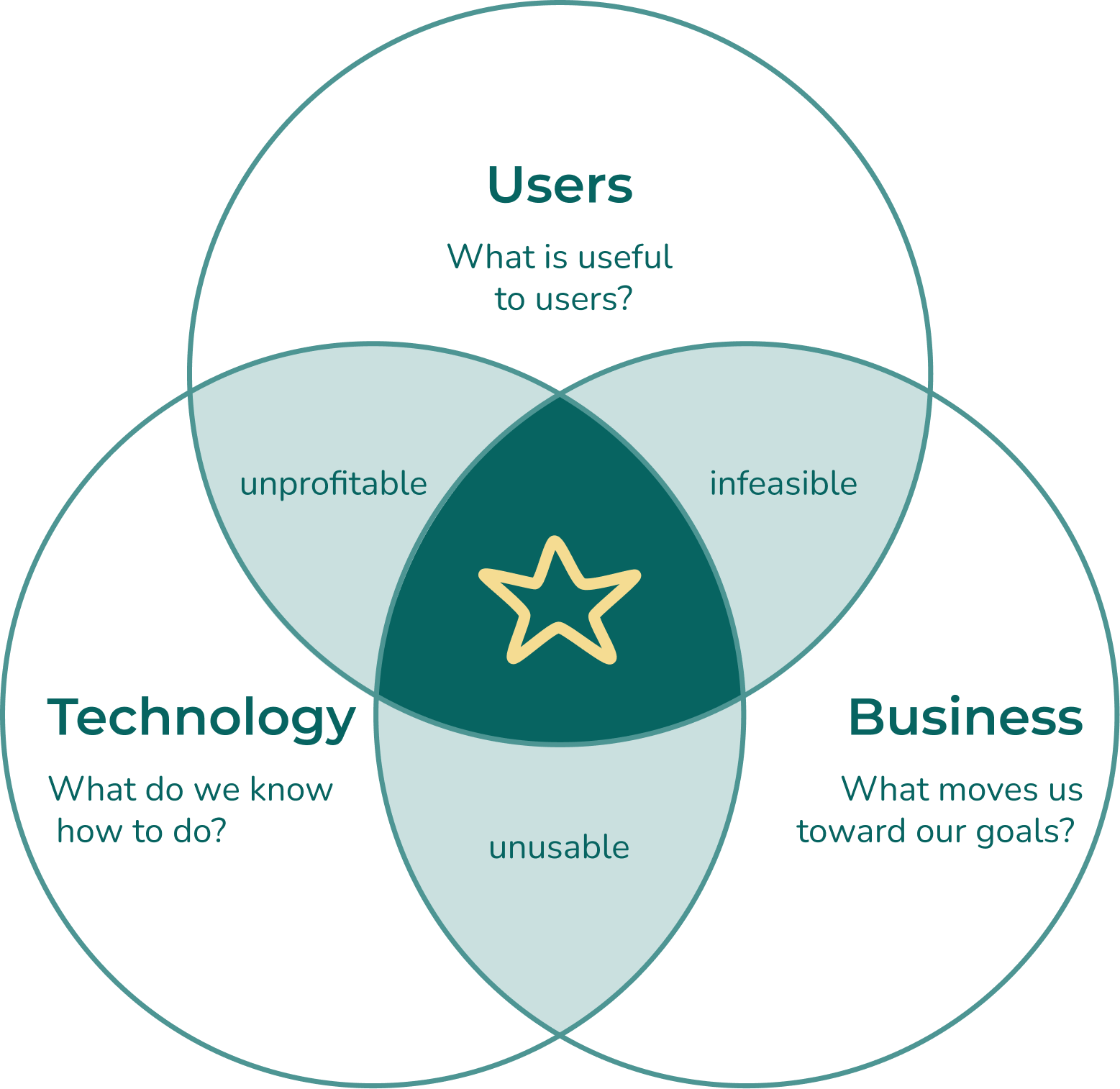 When any of these perspectives is missing, teams risk building something undesirable, unusable, unprofitable, or infeasible. When considering a new idea, consider which of these perspectives it’s primarily coming from and consider how it could impact the other two.