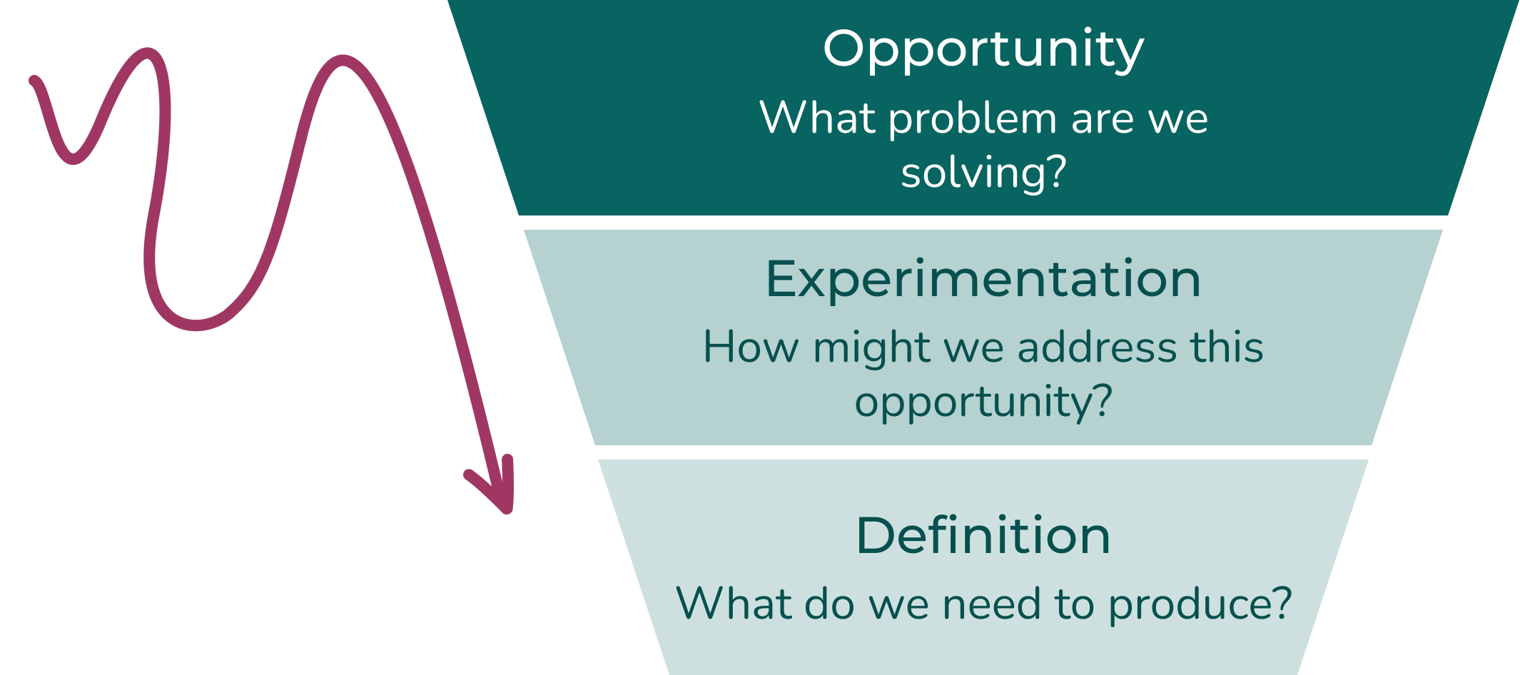 Once teams consider the problem from all three angles, they still need a path that keeps them from slipping back into solution-first thinking. That’s where a simple three-stage progression helps channel efforts towards the right idea, not just the first idea.